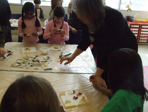 Artist Chris Zonta assists students from The British School in Chicago, IL in creating mosaic tiles.