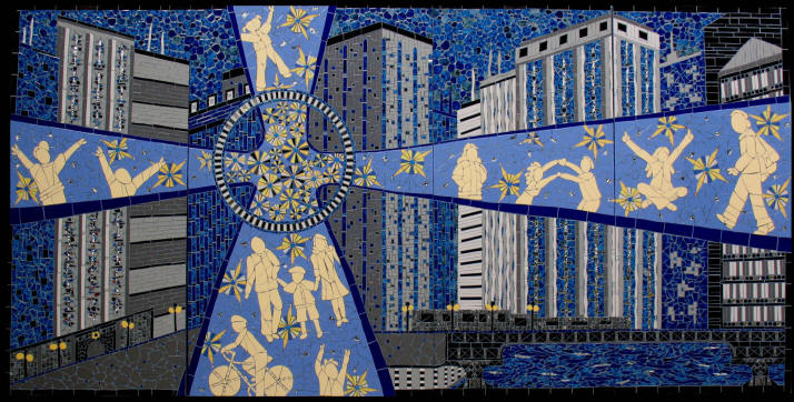Artist Chris Zonta assisted Elementary Students from the Daystar School in Chicago, IL with the creation of this Mosaic Mural titled Crossroad.