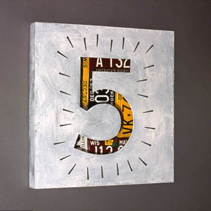 THIS PIECE OF ART BY DEB FLAGEL WAS STOLEN FROM THE APOLLO THEATRE LOBBY ON 10/24/08 A POLICE REPORT HAS BEEN FILED. IF YOU SEE IT ANYWHERE, PLEASE PHONE IMMEDIATELY Five Acrylic, old license plates, antique square nails on board 30" X 30" x 2" deep |