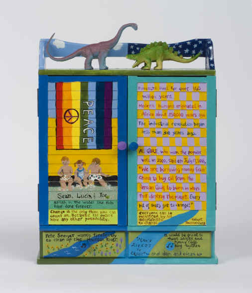 "I am a self-taught artist who began painting upon retirement from a career in social work and advocacy. I originally started painting to entertain myself. I see my work as highly accessible. For some it will be the colors that compel the eye to look more deeply; for others the intricate designs or narrative will be the reason to look further. Part of my creative process is to locate discarded items. Whether I find the item at a garage sale, thrift store or abandoned in the street, I know that every piece has a story. My challenge is to rework these items to have a new tale, often with a written message and a piece of my own interpretation of the past, the present or the future." |