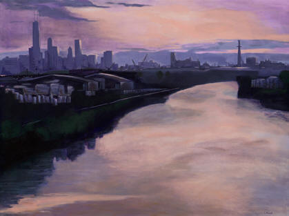 Merel Chicago River Sunset Acrylic on Canvas, 30 x 40" on display at Bett's/B2