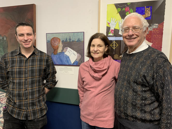 Reuven A. Robinson When I was four, my grandfather invited me to daven (pray) with him in our community's great synagogue. Zadeh (grandpa) was awesome, as was the synagogue's artwork: Bible pictures on tall stained-glass windows, a dome to see heaven fifty feet above, a gold embroidered Ark curtain wherein the Torah scrolls resided, and even more visual wonders. At home, we celebrated all the yom tovim (holidays), made even richer by grandma (Bubeh) and grandpa living downstairs so that I always got a delicious dose of cooking from grandma and my mom. Moreover, Zadeh told me stories of his youth in Grodno, Belarus. My Jewish community was so ever-present, so encompassing back in the 1950s: Kosher butchers, bagel bakeries full of your favorite types, the Hebrew bookstores. There, even Simon my barber, and Mr. Kaplan the druggist, had "hakcents" (accents). In this ethnic-spiritual cocoon, I grew up, so naturally, the first "masterpiece" I painted was of a Jewish holiday scene in watercolors. I went to art school after high school and became an art teacher. I painted murals, illustrated, and even designed a Chanukah children's activity book. I taught high school and enlisted my public high school artists in a unique scroll project for the Spertus College Artifact Center, a children's art museum. In 1994, we organized an art tribute to Jerusalem, reaching about 500 religious school students, and exhibiting in Chicago area venues and also in Jerusalem. I now teach children at PlayThinks School, where we are painting a mural on Genesis, the first book of the Jewish Bible. My private work is representational and abstract, both secular and religious.