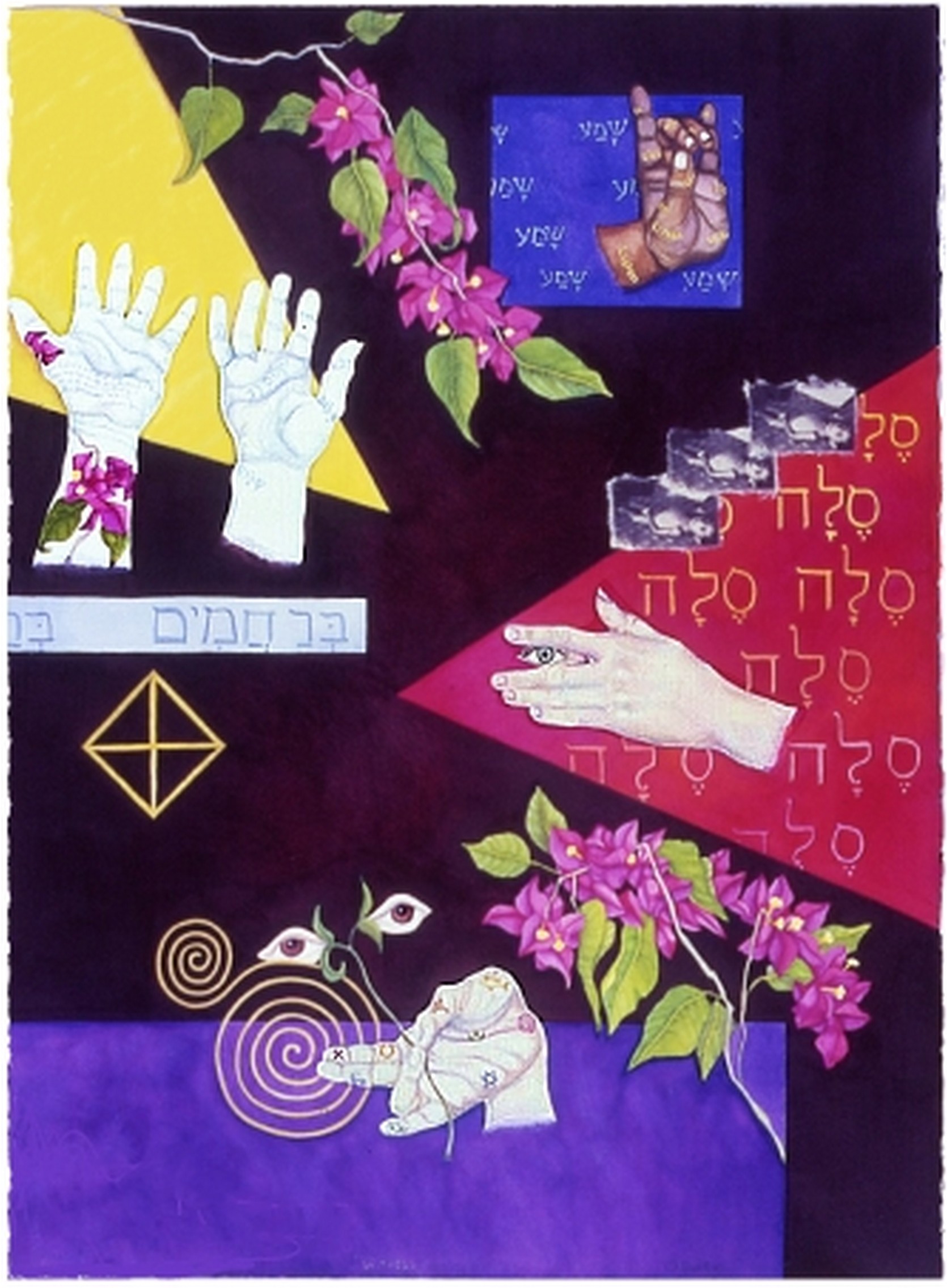 Witness Watercolor with acrylic and collage 31 x 28" $2,500 My works of the "Tikkun Olam" series, investigates the image and symbolism of the hand in its many gestures and roles, especially as it is used in cultures to express healing; healing is reflected as both personal and worldly. The works are intended to create prayers for world healing. After the events of 9/11, my confusion and despair served to push my work to aspire towards a supplication for healing. Many of these works use the symbol of the hands blessing and praying, asking and making a plea for peace, or at least resolution to conflict. Hebrew words and prayers appear painted on the hands to convey these prayers. This whole series was created in the years post 9/11, but are truly relevant today in a time of troubling division and hatred. |