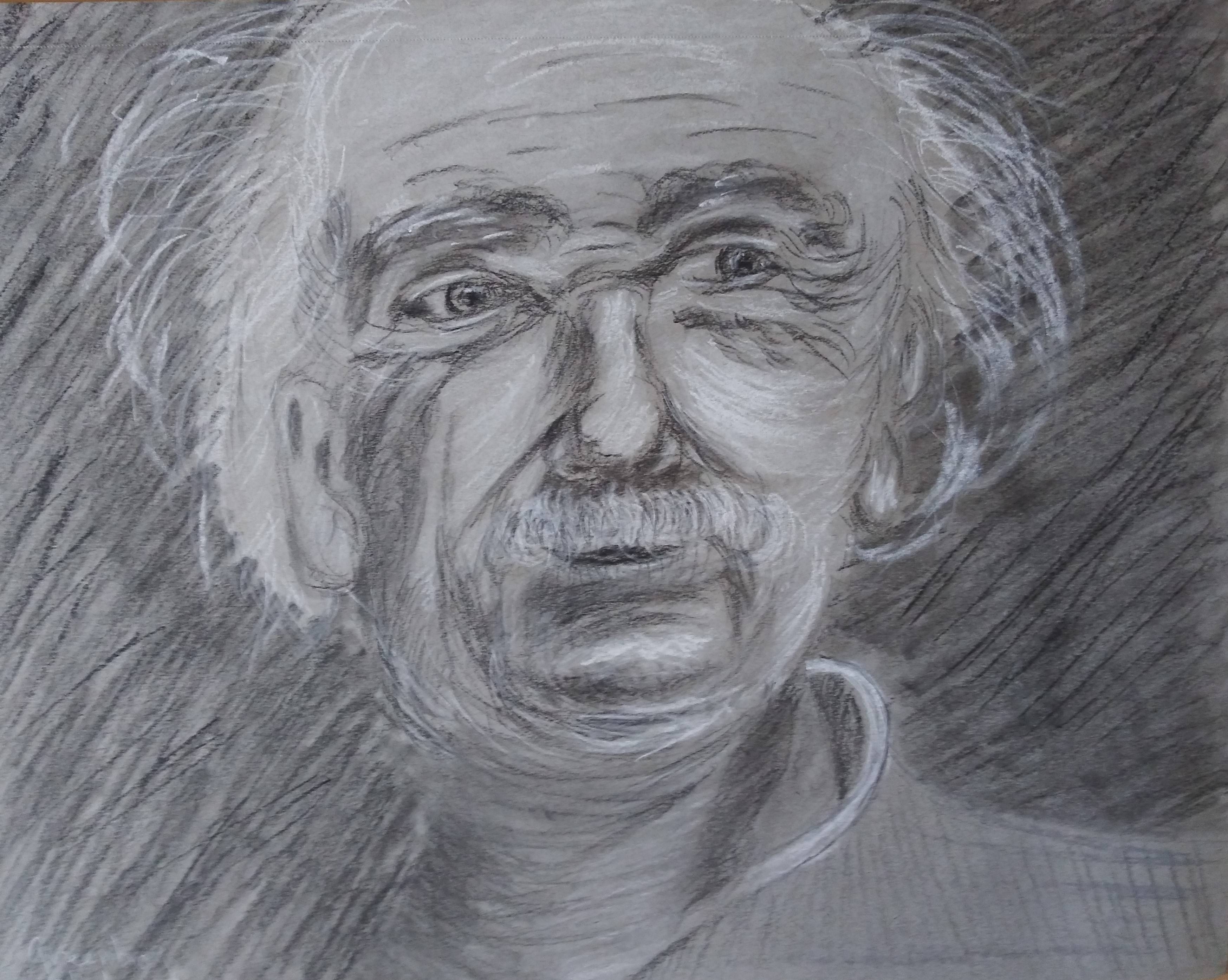 Old Einstein Charcoal Pencil on Paper 14 x 17" $150 This drawing shows the man late in life at Princeton University, reflecting on a life of well-earned renown for his scientific insights while suffering derision for practicing "Jewish science." Despite his rejection of most religious rituals, he respected those who were observant. In America, he actively embraced Zionism and worked passionately for Jewish causes worldwide.