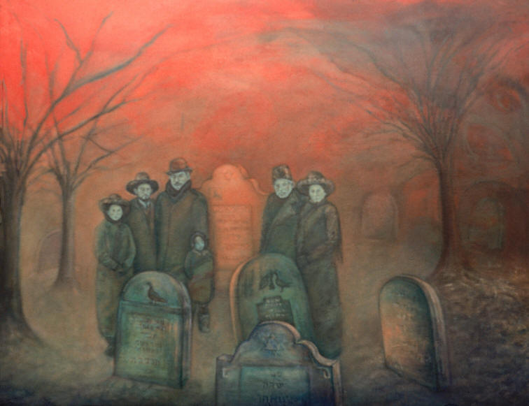 Leslie Hirshfield received her Master of Fine Arts from Pratt Institute, Brooklyn, New York, and her Bachelor of Fine Arts from the University of Illinois, Champaign, Illinois. She taught at the School of Visual Arts in New York, The School of the Art Institute of Chicago, The Evanston Art Center and is currently teaching private classes at her studio at the Noyes Cultural Arts Center in Evanston. This painting is in memory of my mother's family who came to this country before the war leaving family members behind who perished in the Holocaust. Depicted are my grandmother, her nephew, brothers, sister-in-law, and great grandfather at my great grandmother's gravesite in Lodz, Poland, 1912. Although I know them mostly through photographs, stories, and mementos, they are part of my life and helped shape who I am. |