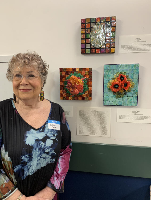 I was born in Chicago. We lived in Albany Park until we moved to Lincolnwood when I was 5 years old. When I was 10, we moved to Southern California, where I began my "formal" Jewish education. In Lincolnwood, I had gone to Sunday School, but in California, I started Hebrew school. As a child, I was painfully shy, and the thought of standing and speaking in front of a sanctuary of people for my Bat Mitzvah, even people I knew and loved, was so terrifying that my parents had to come up with another option. Instead of having a Bat Mitzvah, which would be one day out of my life, I could take an additional year of Hebrew school. I opted for that additional year. My three younger sisters, who were not particularly shy, were not given a choice. They all had their Bat Mitzvahs. While I am no longer as terrified of public speaking as I was back then, I am still not comfortable with it, and when the opportunity came for me to have an adult Bat Mitzvah, I did not take it. Like many of my peers, I can still read Hebrew (albeit very slowly), but except for a few words in prayers, I don't know what the words mean. I love the Hebrew alphabet, and some of my artwork reflects that. I have incorporated the words Chai and Shalom in Hebrew in several of my pieces. I also make polymer clay hamsas and Magen Davids, both as parts of a mosaic and as stand-alone wall hangings. Although I am not as religiously observant as a Jew as I could be, being Jewish has always been a very important part of my life and it always will be. I have done some type of artwork my whole life, but about 20-some years ago I discovered the wonders of polymer clay, and I have never looked back. There is so much that can be done with this medium, from sculpting to "painting" with clay. My favorites are using different techniques to make beautiful surfaces, as well as different ways to manipulate colored clays to make interesting and exciting (or subtle) patterns. I make everything from earrings and pendants to trinket bowls to mosaic wall hangings. The more colorful a piece is, the happier I am. In addition to polymer clay, I make beaded jewelry using various bead stitches. I also like making gel plate prints to be used as collage papers. This is Susan's 2nd exhibition with Anatomically Correct Arts. |