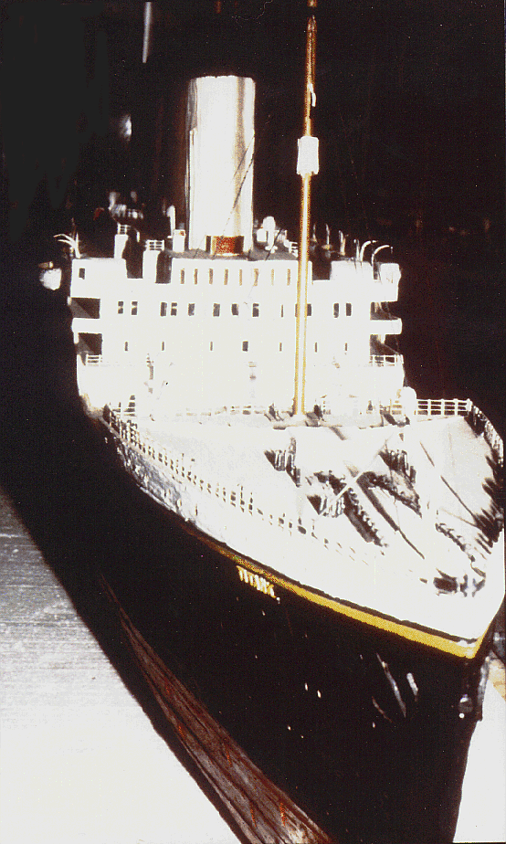 As like the real ship, Wayne's Titanic was built in two phases. The hull was constructed first, then, the superstructure. The superstructure is the part of the ship above the hull which contains the captain's bridge, smokestacks, etc. In a real ship yard, the hull is launched first. It is then towed to a place called the fitting yard, or the place where they build the superstructure and fit it with all the furnishings you would see in a ship. Large ships are launched hull only. The reason is that they tend to be top heavy and much safer to drive out a dry dock and into the water. The Titanic is now resting at the Carol & Barry Kaye Museum of Miniatures in West Los Angeles at 5900 W. Wilshire Blvd.