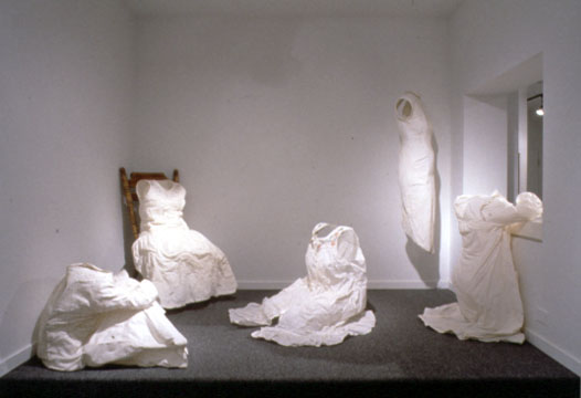 Concerned with the conceptual and aesthetic nature of art, Adrienne creates her work by covering a model (who selects a pose of his or her own choosing and must sit patiently for two - three hours) or other form with plastic sheeting, clothing or bed sheets. In a process Adrienne calls "stiffening", she coats the material with rabbit-skin or another type of glue until it dries into a mummified-like appearance. The model or form is removed, leaving behind a hardened outer shell. Adrienne then adds other objects to the hardened form, such as string, straight pins, and nails to reference the hand work involved in domesticity and to reflect the female voice. Some of her pieces represent the shell (or outer clothing) of an individual left behind after they have passed on, while others are formed in the shape of a cocoon representing a rebirth or spiritual transformation. The finished pieces often appear suspended in time -- as if something has just happened or might happen again. Through this unique art form, Adrienne forces us to look beyond the superficial outer casings of an individual to reveal their inner truth.Adrienne has a background in fiber art from the School of the Art Institute of Chicago and is inspired by the works of Anais Nin, George Segal, Edward and Nancy Kienholz, Annette Messager, Cathy de Moncheaux, Louise Nevelson and Eva Hess, among others. Adrienne has had several solo exhibitions in Nashville, TN and currently participated in SOFA Chicago represented by Finer Things Gallery.