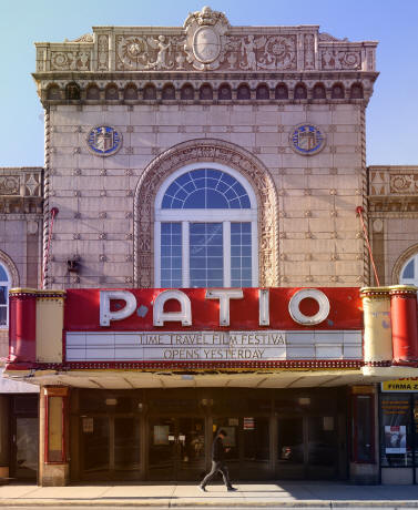 PATIO THEATER 6008 W. IRVING PARK RD, CHICAGO, IL The theater originally opened in 1927 with a capacity of 1,500 people. Its atmospheric auditorium was designed in the Neo-Pompeiien fashion, with various Spanish and Italian architectural influences present as well. One of the theater's most prominent design features is the auditorium ceiling. The ceiling replicates a night sky by use of dark blue paint, blinking lights, and clouds that are displayed on the ceiling via projector. The original horizontal theater marquee is still in place. The vertical section was removed in the 1970s. Still in place within the auditorium is the theater's original Barton pipe organ. Once used to accompany silent films, the organ fell into disrepair and was restored in the 1960’s. After its restoration, it provided music for various shows and sing-alongs. The theater was shuttered in 2001 due to failure of its air conditioning and issues regarding a then new license instated by the City of Chicago. Renovations began on the theater in 2010, and were finished in 2011. The theater officially reopened on June 3, 2011. The first film to touch the screen in over 10 years was Thor. A 2k digital cinema projector was installed in late 2012 from funds raised through a Kickstarter campaign. It retains dual 35mm film projectors. After a period of showing "intermediate run" new releases, the theater transitioned to a rental-based business model in June 2013. The nonprofit Chicago Film Society was in residence there until the theater closed again in April 2014, as owner Demetri Kouvalis reported problems with heating and cooling equipment. The theater re-opened again on December 4, 2014. There was another period of closure, and the theater re-opened May 7, 2016 under new owners with a screening of Jaws. The Kouvanis family sold the theater to Eddie Caranza, who owns the Congress Theater as well. In 2016, Dennis Wolkowicz—president of the Silent Film Society of Chicago and, under the pseudonym Jay Warren, its resident organ accompanist— became the new general manager of the Theater.
