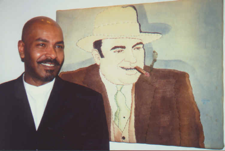 A native of Chicago's Ogden Elementary and Lane Tech High School, Ken Ellis was taught at an early age to sew by his father, a maintenance engineer. After trying his hand at fine art by attending the Chicago Academy for the Arts, the School of the Art Institute and Columbia College, Ellis went back to his love of sewing. He began by painting and sewing on T-shirts - selling them at art fairs, and it wasn't long before he needed a larger format. He first draws on the fabric, then paints the colors on the fabric using special "non-bleeding" dyes. After the dye is set, the images are then embroidered and sewn with batting. "I find it very soothing for my nerves it's therapeutic." Leaving a symbolic signature, Ellis even dots the backs of his quilts with his own blood.